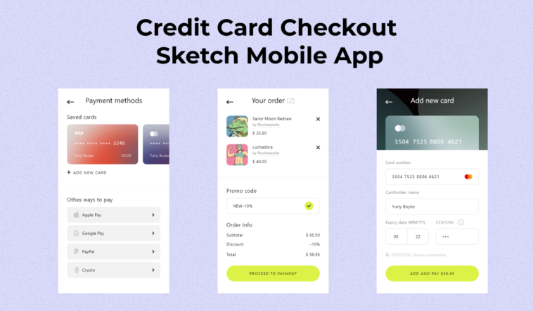 Sketches of the “Your Order”, “Payment Methods”, and “Add New Card” screens of a credit card checkout process .The user interface was created in Sketch .Thanks to Pirog Aleksandr for sharing this.