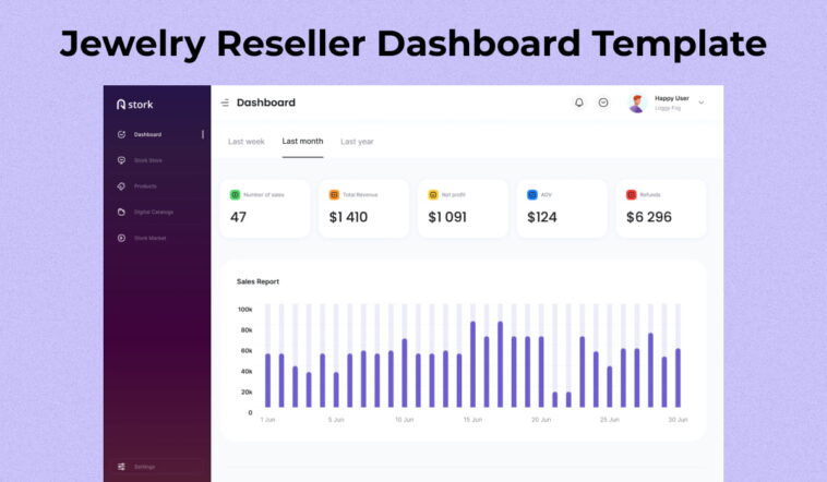 There is a free jewelry reseller dashboard for Figma with a sidebar menu that can be used to access different pages. It also gives an overview of your business in figures and graphs. You can see data for the previous month, week, or year. This is shared by Takasho®.