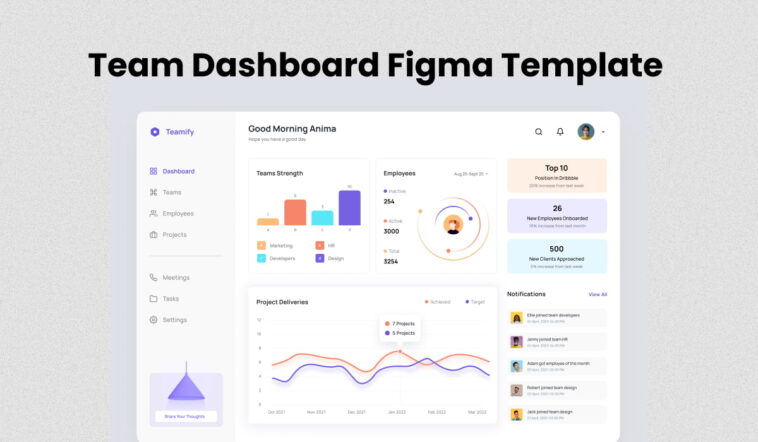 Team dashboard template for work done in teams. There are text and icon-based sidebars. There are also panels displaying charts, notifications, and team statistics. it was shared by the Nickelfox Design.