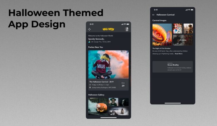 This is a free spooky app concept made in sketch listing the nearest Halloween parties. It is totally free. Excellent work by Prateek Saini.
